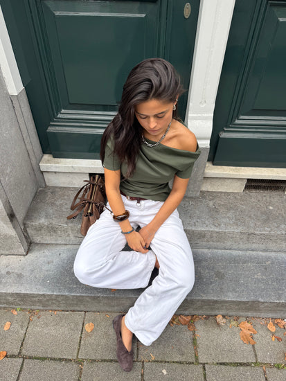 Een zachte, gedrapeerde one-shoulder top in een subtiele olijfgroene tint. De top heeft een asymmetrische halslijn en lichte plooien voor een elegante, flatterende pasvorm. Gemaakt van een soepele stretchstof die comfortabel aanvoelt en moeiteloos meebeweegt. Het model is 1.74 m en draagt normaal maat S/M.