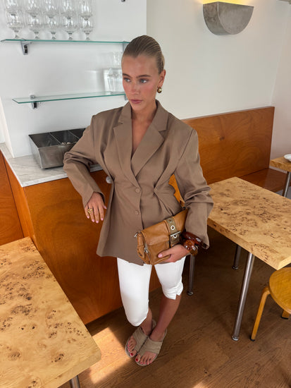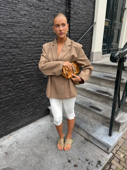 Een elegante blazer in een tijdloze camel kleur. De blazer kan getailleerd worden gedragen, waardoor je een vrouwelijke en verfijnde look creëert. Het item heeft een moderne pasvorm en kan zowel casual als chic gestyled worden. Het model is 1.74 m en draagt normaal maat M/L.