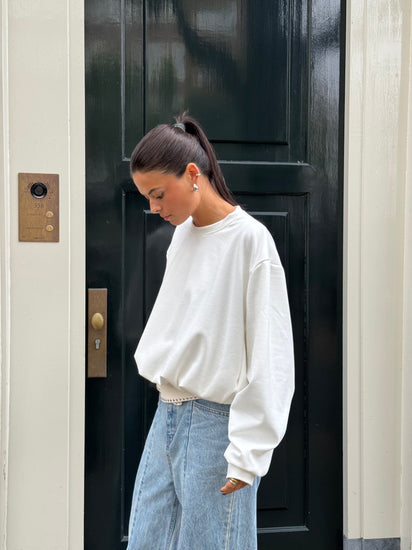 Een zachte, soepelvallende sweater in het wit, ontworpen met een elegante draped fit die zorgt voor een effortless look. Het item heeft een oversized pasvorm en komt in one size, waardoor het comfortabel en relaxed valt. Het model is 1.74 m en draagt normaal maat S/M.