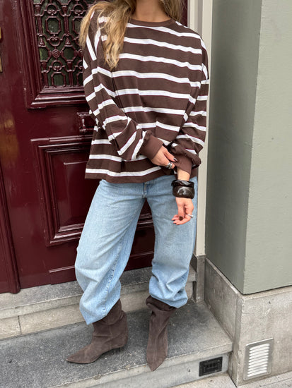 Een tijdloze long sleeve in bruin met subtiele streepdetails. De oversized fit geeft een moderne en comfortabele look. Het item komt in one size en valt losjes, ideaal voor een nonchalante maar stijlvolle uitstraling. Het model is 1.74 m en draagt normaal maat S/M.