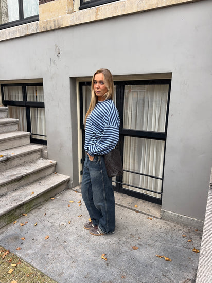 Een casual gestreepte top in blauw met donkerblauwe strepen. De relaxed fit en zachte stof zorgen voor een comfortabele, effortless look — perfect om te combineren met je favoriete denim. Het item heeft een one size pasvorm en valt losjes voor een nonchalante uitstraling. Het model is 1.74 m en draagt normaal maat S/M.