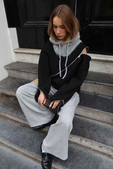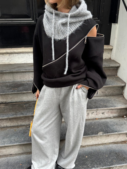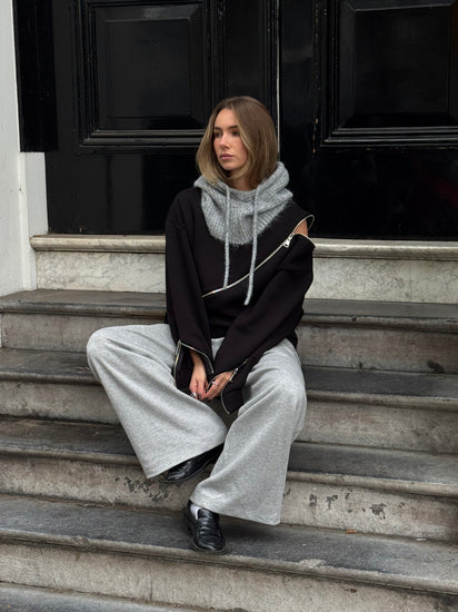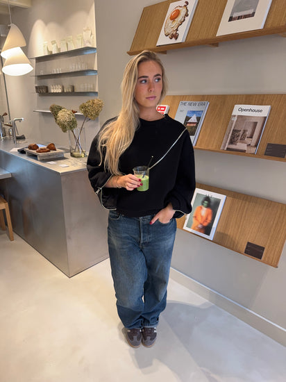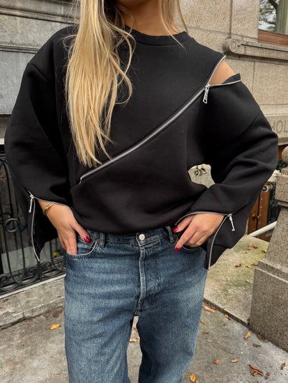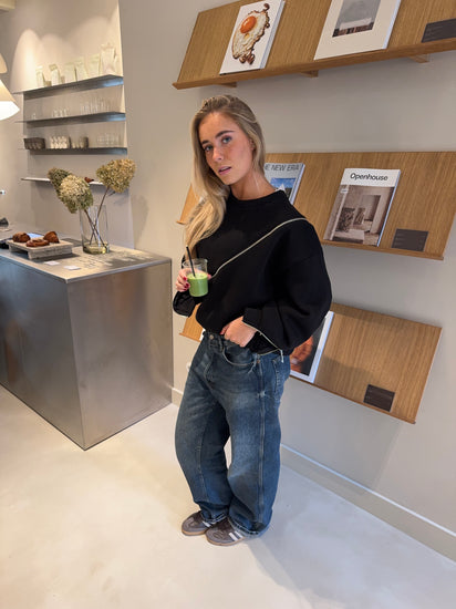 Een comfortabele zwarte sweater met subtiele zipper details op de schouders. De trui heeft een oversized pasvorm en een zachte, iets stretchende stof die zorgt voor een relaxed en modern silhouet. Perfect voor een casual maar stijlvolle look. Het item komt in one size en valt moeiteloos. Het model is 1.74 m en draagt normaal maat S/M.