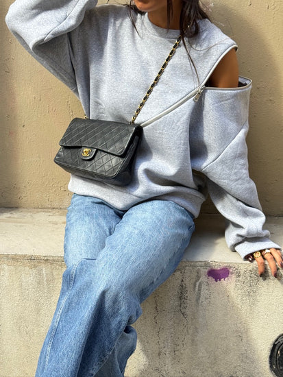 Een comfortabele sweater in de kleur grijs, uitgevoerd met subtiele zipper details. Het item heeft een oversized pasvorm en komt in one size, waardoor het moeiteloos en relaxed valt. Het model is 1.74 m en draagt normaal maat S/M.