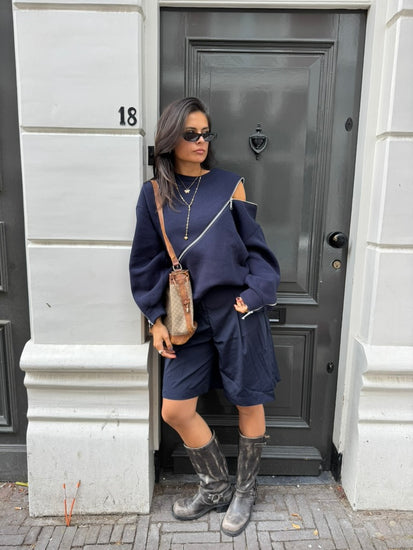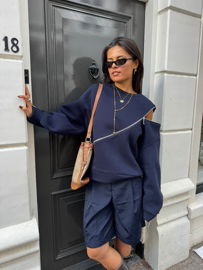 Een comfortabele sweater in de kleur navy, uitgevoerd met subtiele zipper details. Het item heeft een oversized pasvorm en komt in one size, waardoor het moeiteloos en relaxed valt. Het model is 1.74 m en draagt normaal maat S/M.