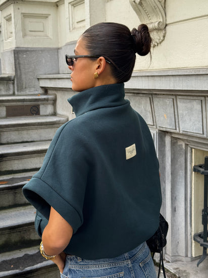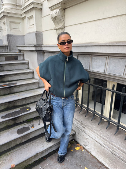 Een stijlvol vest in de kleur dark green, uitgevoerd met een ritssluiting aan de voorzijde. Dankzij de oversized pasvorm heeft het vest een moderne en comfortabele uitstraling. Het item komt in one size en valt losjes. Het model is 1.74 m en draagt normaal maat S/M.